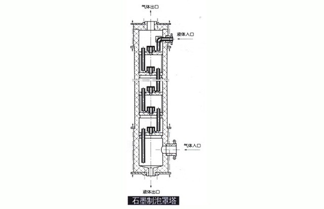 石墨制塔類設備主要有篩板塔泡罩塔、填料塔、浮閥塔等,用作對有機產品、鹽酸、HCL氣體、S02氣體等腐蝕性介質之吸收、濃縮、解析、蒸餾、精餾、過濾、洗滌等.塔徑可至0 200-01500.也可按用戶來圖制作.亦可按用戶工藝條 件代為設計、制造及安裝調試。其中填料塔尤多用于含HCL氣體,S02氣體之尾氣處理,消除環境污染之同時回收有用成分。除圖示結構外另有氣體由下部進入之 結構,尤其適用于HCL氣體含