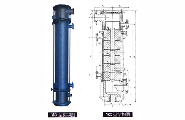 YKA型圓塊式石墨熱交換器以圓柱 體型單元積木式疊裝而成,結構強度高,石墨件間墊以四氟質或特種橡膠質等質 地密封件.密封可靠,設備導熱效率高,耐溫、抗沖擊、耐壓等性能優越。本型設備分成I型與II型,I型載熱體切向進入換熱塊,相鄰兩塊方向錯開,縱向物料經短 通逐塊再分配而紊流效應顯著,下封頭附 加氣液分離的則成冷凝器,若上封頭改成 蒸發室則形成蒸發器。YKA-II型載熱體徑 向進入換熱塊,殼體按外折